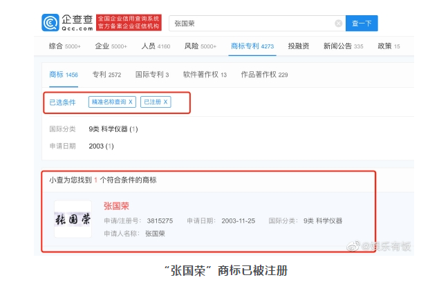 据悉,此商标也是目前唯一一个注册成功的张国荣商标。 (原标题:“张国荣”商标被注册 注册人也叫张国荣) 责编:小美 【特别声明:部分文字及图片来源于网络,仅供学习和交流使用,不具有任何商业用途,其目的在于传递更多的信息,并不代表本平台赞同其观点。版权归原作者所有,如涉版权或来源标注有误,请及时和我们取得联系,我们将迅速处理,谢谢!】 解读新闻热点、呈现敏感事件、更多独家分析,尽在以下微信公号,扫描二维码免费阅读。