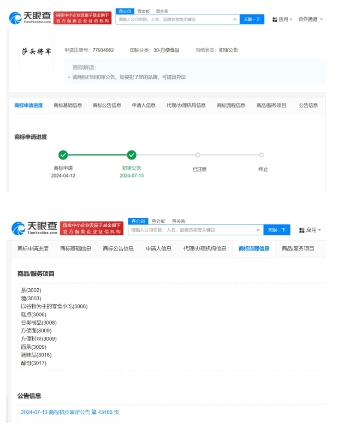 天眼查App显示,今年4月,有自然人申请注册“莎头将军”商标,国际分类为方便食品,7月13日,该商标状态已更新为“初审公告”。