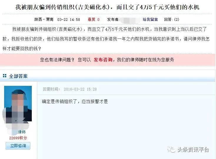 在投诉直通车网站上,就曾有网友投诉“吉美磁化水龙头直销员恶意夸大其产品作用”,投诉内容如下:“2017年9月,经朋友介绍,安装了一款吉美磁化水龙头,售价4000元,直销员称其具有包治百病等功效,并写下承诺,半年内无效全额退款,使用一个月后没有一点功效,要求退款后一直拖。” 也有网友投诉:“我爸爸被同村村主任带去吉美公司做直销业务员,多次去长沙总公司开会听课,并购买了很多保健品日用品及磁化水龙头和空气净化器,价格不菲。而且说的一套一套的,能包治百病什么的,我感觉是进了传销窝点,多次劝说都没用,感觉被洗脑了。我只想相关部门帮我了解一下这个公司是否合法。” |